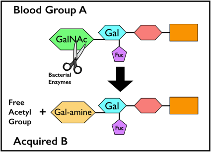 Usually, Acquired B occurs when the RBCs from a blood group A patient come in contact with bacterial enzymes known as “deacetylases.” These enzymes, commonly carried by bacteria that live in the colon, catalyze the removal of the acetyl group from the residue that gives the A antigen its specificity, N-acetylgalactosamine (GalNAc). This modification leaves the A-specific sugar as galactosamine (N-acetylgalactosamine with the acetyl group removed = galactosamine). Recall that normally, the group B-specific sugar is galactose.