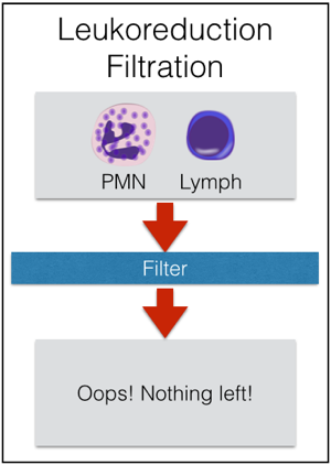 Granulocytes have pretty much the shortest shelf life of any product that we collect directly from donors. They should be transfused “as soon as possible” after collection, but definitely within 24 hours of collection. They are stored at room temperature, like platelets, but they should not be continuously agitated, unlike platelets. This out-of-the-ordinary storage is really another reason that granulocytes are only collected on an “as-needed” basis. Granulocytes are also unusual in that they are almost always issued prior to the availability of the infectious disease screening results! For that reason, essentially all unrelated apheresis granulocyte donors will be recent apheresis platelet donors who have had negative results on a donation within the previous 30 days. We still perform the testing, of course, but the results just aren’t available before the product has to be transfused. Because there are so many RBCs in each granulocyte product, the donor must be ABO compatible with the recipient, and the unit must be crossmatch-compatible with the recipient. By AABB Standards, if more than 2 mL of RBCs are present in any product, those RBCs must be compatible with the recipient’s plasma antibodies. In addition, if the recipient has an unexpected RBC antibody (like anti-D, anti-K, or any others), the granulocyte unit must come from someone who is negative for that antigen, as well. To make matters even more challenging, if the patient has developed anti-HLA antibodies (most commonly in previously pregnant females), then the donor should be HLA matched or at least HLA compatible with the patient’s antibodies. Finally, to complete the weirdness, it is essential to remember which modifications CAN and CAN’T be done to granulocytes. First, granulocytes CAN (and must) be irradiated to prevent Transfusion-associated Graft vs Host Disease (TA-GVHD). This is an extremely fresh product, full of highly active T-lymphocytes in addition to the granulocytes, and the recipient is immunocompromised, by definition. As a result, irradiation is essential to deactivate those donor T-lymphocytes and protect the patient (see image below). Second, granulocytes CAN’T be leukocyte-reduced. Every now and then, people will ask me about leukoreducing granulocytes for prevention of Cytomegalovirus (CMV) transmission. Rather than make fun of them, I usually just sit quietly while they work it out themselves (“OK, let’s see: Granulocytes are WBCs, which some people call ‘leukocytes,’ so if I leukocyte-reduce a unit of a product that is primarily composed of leukocytes, I would be left with…nothing! OHHHH!”). As a result of our inability to make a granulocyte product “CMV-safe” by leukoreduction, CMV-seronegative donors will be recruited to provide products for CMV-seronegative patients whenever possible. Note that it is totally fine to run granulocyte concentrate through a “standard” transfusion filter, just not a leukoreduction or microaggregate filter.