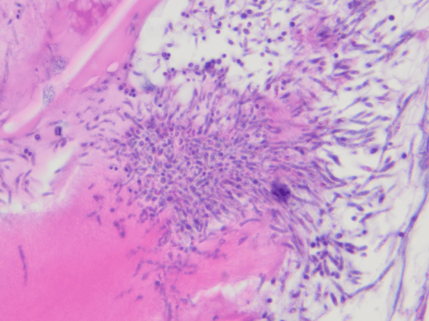 A 44 year old male presented to the emergency department with severe, throbbing back pain in his mid-thoracic spine. He states the pain began a couple weeks ago and noted no recent fevers or night sweats, but does admit to chills. His past medical history is significant for end stage renal disease requiring dialysis, insulin dependent diabetes mellitus, and multiple amputations. On physical examination, there was tenderness to palpation along spine in mid-thoracic region. Lab work showed a normal white blood cell count, C reactive protein of 0.90 mg/dL (0.00 – 0.50 mg/dL), and an erythrocyte sedimentation rate of 60.0 mm/hr (0.0 -10.0 mm/hr). MRI of the spine was consistent with discitis and osteomyelitis at T7-8 with compression fractures causing spinal stenosis and cord compression. Given the concern for an infection process, blood cultures were collected and interventional radiology performed a bone biopsy. The specimen was sent for bacterial, fungal, and AFB cultures as well as for histology.