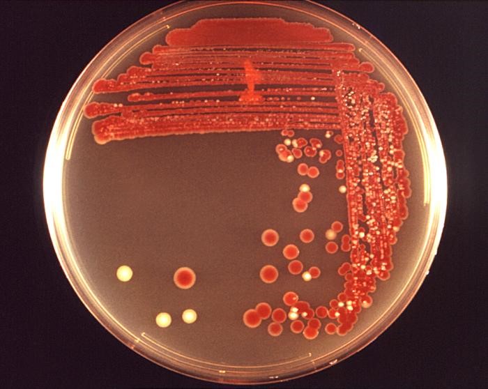 Serratia marcescens is a motile, facultatively anaerobic, gram negative bacillus of the Enterobacteriaciae family. Some strains of Serratia produce a distinctive brick red pigment, prodigiosin (Image 4), although non pigmented strains are frequently isolated from human infection sites. Serratia marcescens is one of the few Enterobacteriacea that produces DNAse, lipase, and gelatinase. It does not usually ferment lactose. This species is widely present in the environment, including in animals, insects, plants, water, and soil, but unlike other Enterobacteriaciae species it is not a typical component of normal human fecal flora.