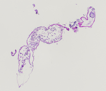 Gross examination of the appendectomy specimen showed an unremarkable appendix that measured 5.7 cm in length by 0.7 cm in diameter. There was no evidence of perforation. On sectioning, a small, white, “worm-like” structure (0.6 x 0.1 cm) was identified at the tip of the appendix and submitted for histologic examination. Microscopic review identified a female nematode with many eggs characteristic of Enterobius vermicularis. There was no acute inflammatory process identified upon microscopic review of the appendix.