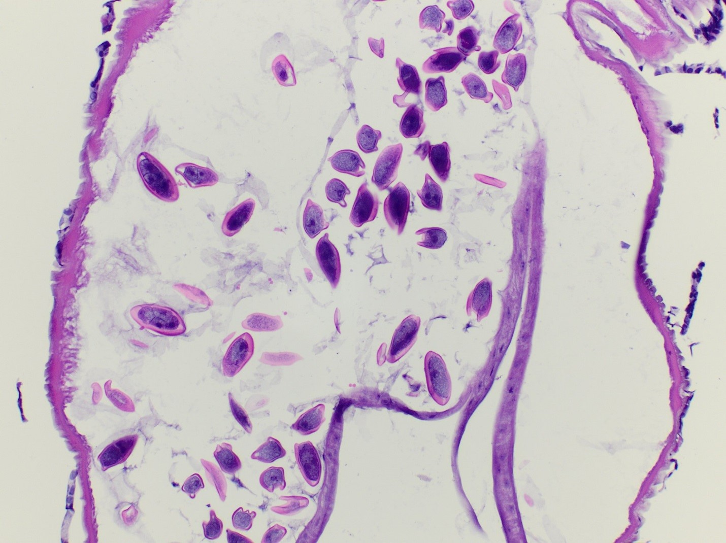Humans are the only known host of E. vermicularis and become infected by ingesting embryonated eggs from feces or handling contaminated materials such as clothing, bed linens or from bathroom surfaces. Pinworm has a direct lifecycle and the larvae hatch in the small intestines and develop into adult worms that occupy the colon. It takes about one month from ingestion of infective eggs for E. vermicularis eggs then to be shed on the perianal folds.
