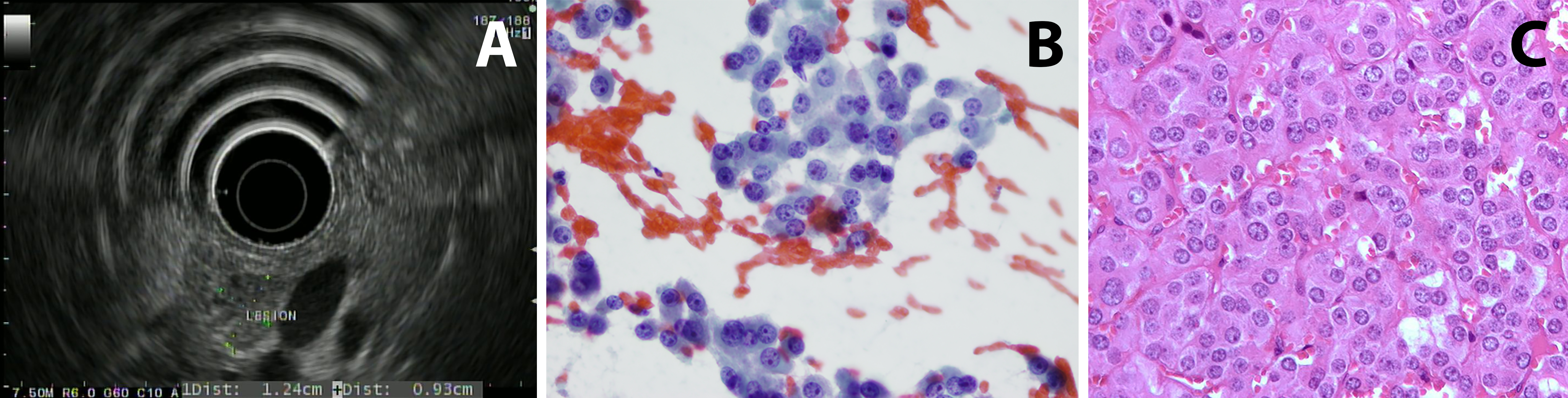Case 1: Patient 1 is a 75 year old man with a history of gastroesophageal reflux disease (treated with a proton-pump inhibitor) who had an episode of diaphoresis and altered mental status at 3:30 am. He was found to have a glucose of 20 when rescue arrived. He was brought to the ED and symptoms resolved after glucose administration. Work-up showed fasting C-peptide of 3.5 (normal range: 1.1-4.4 ng/mL) ruling out excess insulin use; proinsulin was elevated at 300 (normal range: 3-20 pmol/L). Serum chromogranin A was noted to be mildly elevated. He had a CT scan of the abdomen that did not show any abnormal enhancement or concerning lesion. Endoscopic ultrasound (EUS) imaging demonstrated a slightly hypoechoic mass in the pancreatic head with a hyperechoic halo margin. The mass was adjacent to, although not invading, the portal vein. The remainder of the pancreatic head had a normal echotexture (figure 1A). Fine needle aspiration and biopsy of the lesion were performed; microscopic images are provided (figures 1B and 1C).