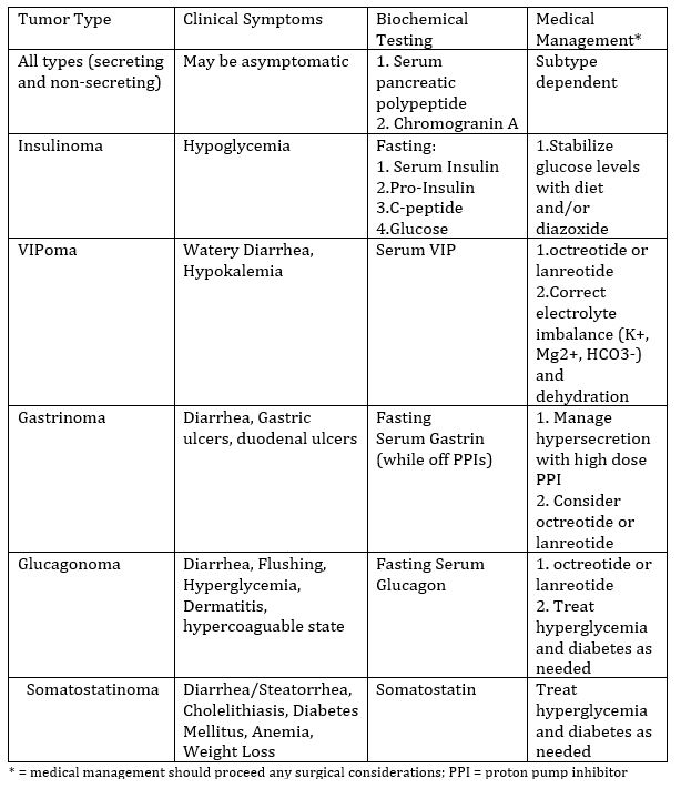 - Biochemical evaluation if functional tumor (see Table 1, highlighted is our case presentation of insulinoma)