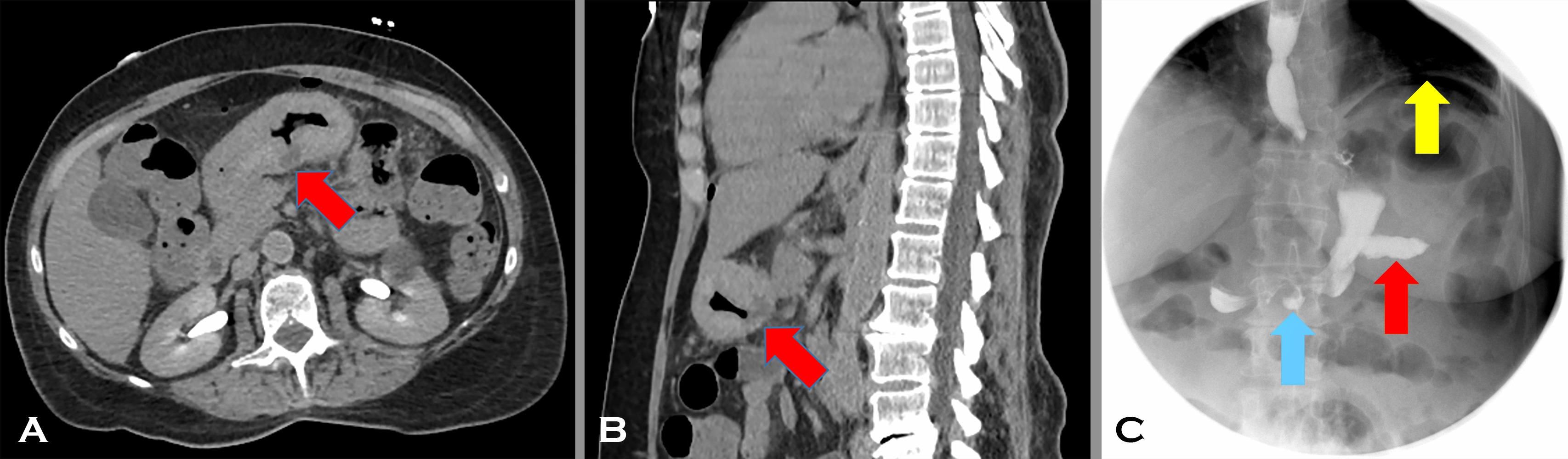 In our case, following diagnosis on the biopsy, perioperative chemotherapy with 3 cycles of 5-flurouracil, leucovorin, oxaliplatin, and docetaxel (FLOT) was planned. However, after just one cycle, the patient’s clinical course became complicated with severe abdominal pain. A CT scan of the abdomen/pelvis with no intravenous or oral contrast showed a perforated antral ulcer (Image 4 A axial and B sagittal reconstructions, with Red arrows indicating the full thickness gastric wall defect). Findings were confirmed on a water-soluble contrast swallow test (Image 4 C: Blue arrow indicating the ulcer and Red arrow indicating extraluminal contrast layering in the peritoneal cavity). Free intraperitoneal air due to perforation was also evident (Image 4 C: Yellow arrow). Image 4, composite radiographs A-C.