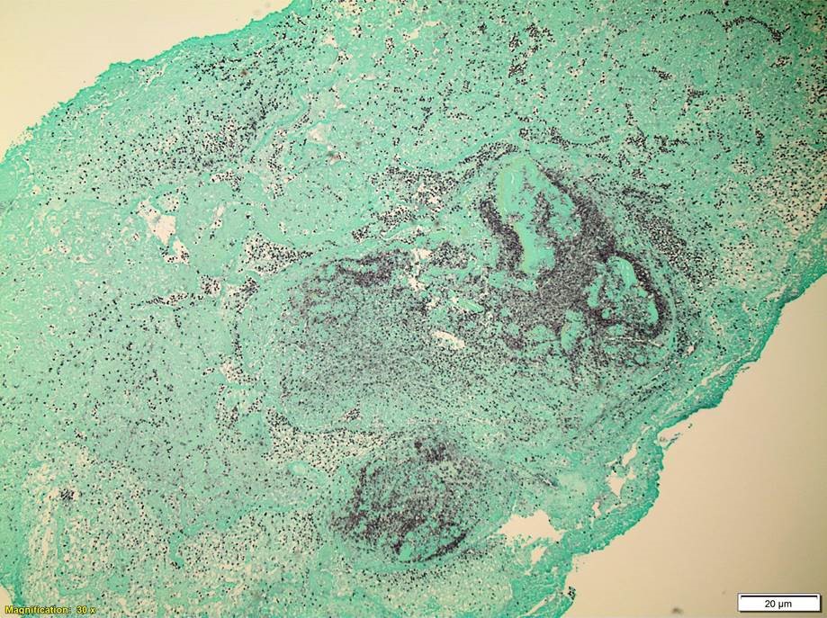 Ampicillin or vancomycin are acceptable treatment options for Enterococcal infections if found to be susceptible by antibiotic testing. It is important to note, Enterococcus spp. are intrinsically resistant to cephalosporins, aminoglycosides, trimethoprim-sulfamethoxazole, and clindamycin. For serious infections, including infective endocarditis, it is recommended to treat with a cell wall active agent such as ampicillin and an aminoglycoside (gentamicin or streptomycin) to create a synergistic bactericidal effect. Emergence of E. faecium acquired vancomycin resistance (VanA/VanB) is increasing and more board spectrum agents such as daptomycin and linezolid are necessary to effectively treat these infections. In the case of our patient, upon identification of E. faecalis from multiple blood cultures, his antibiotics were switched to IV ampicillin and gentamicin. He underwent valve replacement surgery and both the aortic and mitral valves grew E.faecalis as well and showed numerous bacterial cocci on histology (Images 3 & 4). He completed a six week course of ampicillin and gentamicin and was discharged home in good condition.
