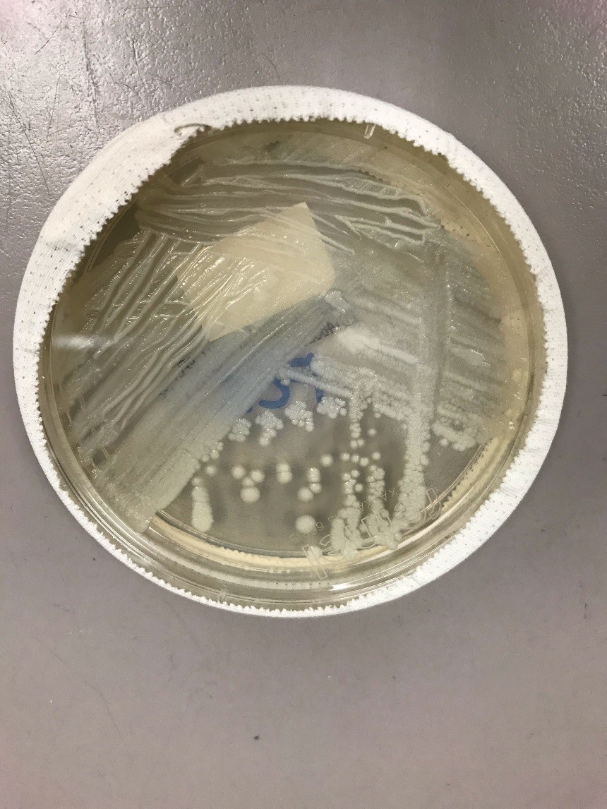 A 35 year old female with a history of BRCA-positive breast cancer (status-post right radical mastectomy February 2018) underwent prophylactic left mastectomy and revision of right mastectomy. She received prophylactic clindamycin and cefazolin. She was discharged on post-op day 5 with bacitracin and 3 weeks of cefadroxil. She initially healed well. On post-op day 43 she noted drainage from the left incision site. At presentation she was afebrile. There was a 3.0 x 2.0 cm area of induration and erythema on the right lateral aspect of her abdominal incision with seropurulent drainage. Incision and drainage was performed in office and a swab of the fluid was sent to microbiology. The initial gram stain and cultures were negative for bacteria. The patient was placed on sulfamethoxazole-trimethoprim and levofloxacin. At follow up 7 days later, another abscess was medial to the prior site was incised and drained. A swab of the fluid was sent to microbiology for bacterial and fungal cultures.