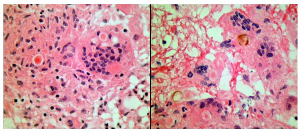 Frozen section evaluation during the time of surgery showed granulomatous inflammation. Septate hyphae were observed on the fungal smear. Following surgery, amphotericin was added. Histologic evaluation of the tissue submitted from surgery showed pyogranulomatous inflammation with pigmented, spore-like structures present in multinucleated giant cells on hematoxylin and eosin (H&E) stain (Image 2). Grocott’s methenamine silver (GMS) stain also highlighted short segments of septate hyphae (Image 3).