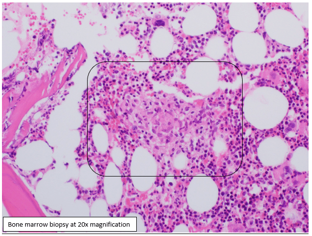 Case History An 83 year old male with bladder cancer was treated with Mycobacterium bovis Bacillus Calmette-Guérin (BCG), his last treatment occurring 1.5 months prior to presentation. He has a past medical history of chronic obstructive pulmonary disease, hypertension, obstructive sleep apnea, obesity, and diabetes. The patient has been hospitalized four times over the last two months and his symptoms include generalized weakness, malaise, shortness of breath and recurrent fever. He was found to have patchy lung infiltrates and he was diagnosed with pneumonia, COPD exacerbation and symptoms of heart filature. He was treated previously with antibiotics, steroids and fluid management which would temporarily relieve his symptoms. He presents to the hospital again, four days after his last hospital discharge, with generalized weakness, malaise, shortness of breath and recurrent fever. On initial evaluation he was found to be pancytopenic.