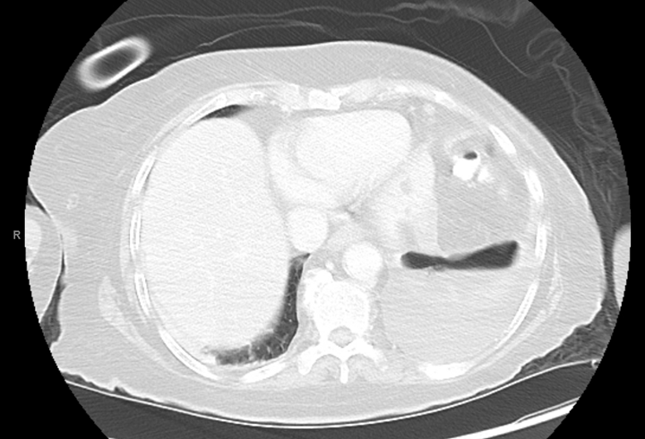 An 83 year old female with a past medical history of breast cancer, multiple strokes, dysphagia, hypertension and gastroesophageal reflux disease (GERD) presented to an outside hospital with altered mental status, metabolic encephalopathy, decreased appetite, acute kidney injury, and E. coli/Proteus urinary tract infection (UTI). There, she was diagnosed with a perforated gastric ulcer, which was repaired, with a gastrostomy (G) tube in place. The patient later developed a fever and an aspiration pneumonia, which was treated with ampicillin/sulbactam. A follow up imaging revealed a new gastric perforation along the fundus of the stomach with perisplenic fluid collection, along with a pleural effusion with possible communication with the fluid collection in the stomach. Due to her complex medical history, an additional intervention was not pursued and the family agreed to comfort measures, and the patient was discharged home.