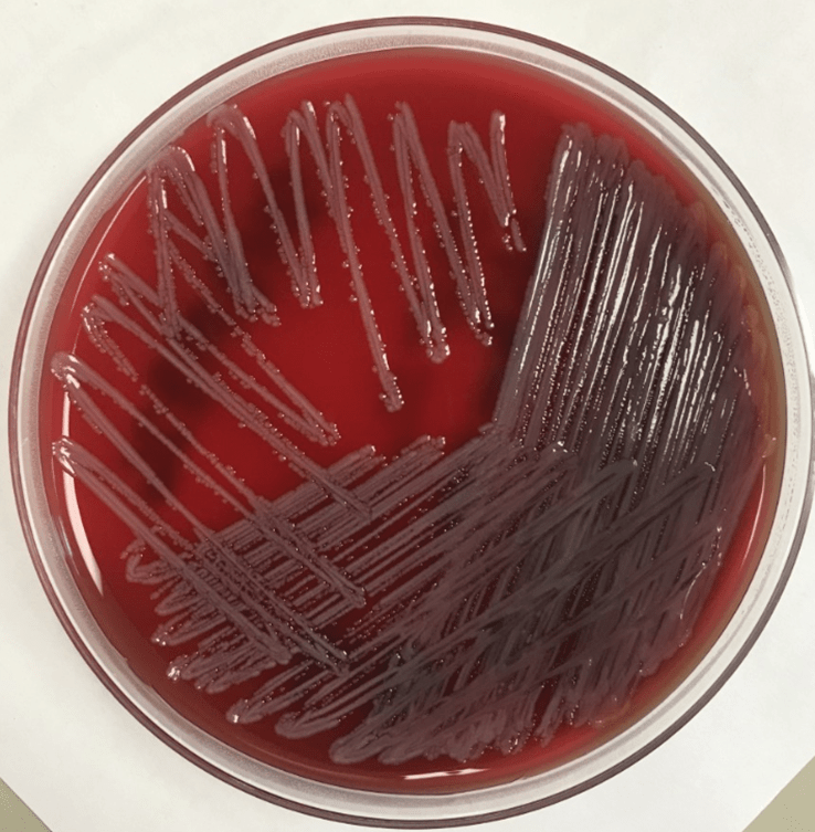 VIR drained the perisplenic abscess, which was sent to the microbiology lab for aerobic & anaerobic cultures. The Gram stain revealed many white blood cells (WBC’s) and rare yeast. The culture grew 3+ Burkholderia cepacia complex (Burkholderia cenocepacia) and 3+ Candida glabrata. The Gram stain and colony of the subculture of B. cepacia on a blood agar plate are shown in Images 2 and 3. C. glabrata was also isolated from the urine culture. Susceptibility testing of B. cepacia showed that it was sensitive to both meropenem and trimethoprim-sulfamethoxazole. Vancomycin and zosyn were stopped and the patient was switched to IV trimethoprim sulfamethoxazole for B. cepacia and IV micafungin for C. glabrata.