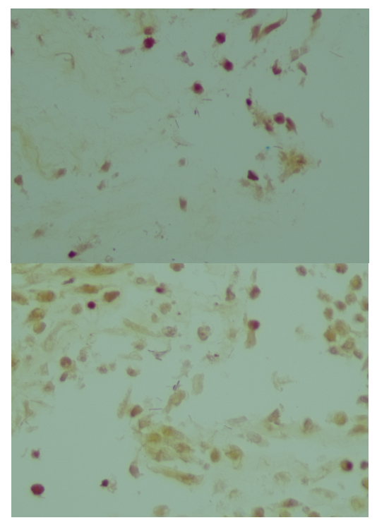 Abdominal CT revealed multiple uterine leiomyomas (fibroids), with the largest measuring up to 13.2 cm and demonstrating characteristics concerning for pyomyoma (abscess arising in leiomyoma). The patient underwent exploratory laparotomy and myomectomy. Gross images of the resected uterine mass demonstrated a circumscribed whorled nodular lesion with patchy necrosis (Image 1). Histologic examination of the resected lesion demonstrated a bland smooth muscle tumor, devoid of cytologic atypia and mitotic activity, with area of abscess formation showing necrosis and abundant neutrophils leading to a diagnosis of “Leiomyoma with severe acute inflammation, areas of necrosis and abscess formation, consistent with pyomyoma (14 cm)” (Image 2). A tissue Gram stain demonstrates multiple morphotypes of bacteria (image 3). Blood cultures, drawn on admission, flagged positive and the Gram stain revealed gram negative rods and blood, chocolate and Maconkey agars grew creamy gray non-hemolytic colonies that did not ferment lactose. MALDI-TOF mass spectrometry was performed and identified the isolate as Salmonella species. A triple sugar iron agar slant was set up to confirm the phenotype of a non-typhoidal serovar of Salmonella. Growth of the organism demonstrated abundant hydrogen sulfide production, an acidic butt, and an alkaline slant, confirming the nontyphoidal phenotype.
