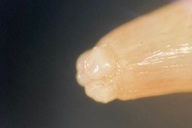 Necator americanus and Ancylostoma duodenale are the hookworms. Adult females measure up to 1.2 cm, and these two species are differentiated by examination of the mouthparts: Necator americanus has cutting plates, while Ancylostoma duodenale has cutting teeth. In addition to the large size difference between hookworms and roundworms, the lamprey-like appearance of these mouthparts is notably different from the “fleshy lips” of Ascaris. Hookworms and roundworms, however, are similar in that their larvae have the ability to migrate through tissue to the blood stream then the lungs, where they can cause Löffler syndrome and are expectorated then swallowed before reaching the small bowel. Unlike Ascaris, the larvae of which hatch from ingested eggs and penetrate the host through the bowel wall to get to the lung capillary beds where they can mature, hookworm larvae hatch outside the body and, on contact with a host (once again, lamprey-style), directly penetrate the skin, enter the circulation, travel to the lungs, then migrate up the bronchial tree to be swallowed. If ingested, Ancylostoma larvae can mature into adults in bowel without needing to migrate through the lungs.