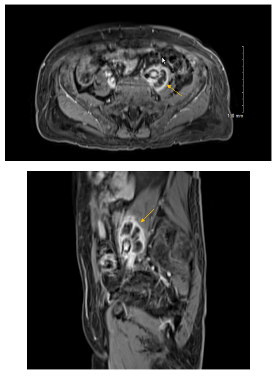 This case describes an uncommon complication of BCG immunomodulator therapy as a treatment of superficial papillary urothelial carcinoma. BCG’s use as a therapeutic intervention for malignancy is unique. It is postulated that the instillation of the organism stimulates the host’s immune response which can cause inflammation and sloughing of the bladder lining (urothelial cells), which effectively removes foci of superficial pre-cancerous in situ lesions or other intact foci of superficial urothelial carcinoma. The typical course of treatment is 6 cycles of BCG. Local inflammation resulting in cystitis is the most common complication experienced in 27-95% of patients.1 However, approximately 19% of patients undergoing BCG therapy experience severe enough complications to prematurely terminate BCG therapy, according to one study by the European Organization for Research and Treatment of Cancer.2 The patient described developed systemic symptoms during the course of his BCG therapy which prompted his physicians to terminate it. Although far less common than local genitourinary symptoms, mycotic aneurysms can occur in an estimated 0.7-1.4% of cases.1 Psoas abscesses are thought to arise from mycotic aneurysm leak.3