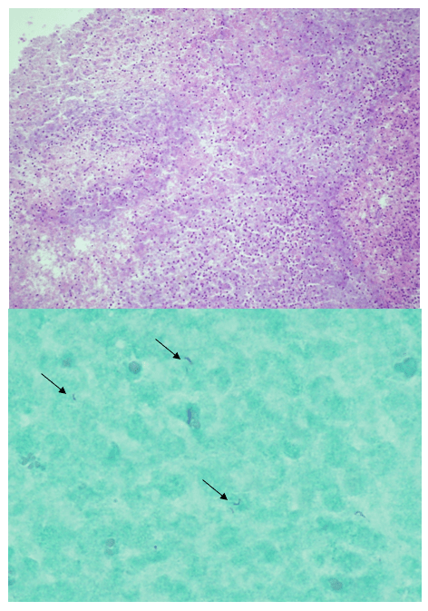 Bottom) AFB stain demonstrating multiple AFB (see arrows) within the necrotic cellular debris (50x oil immersion objective).