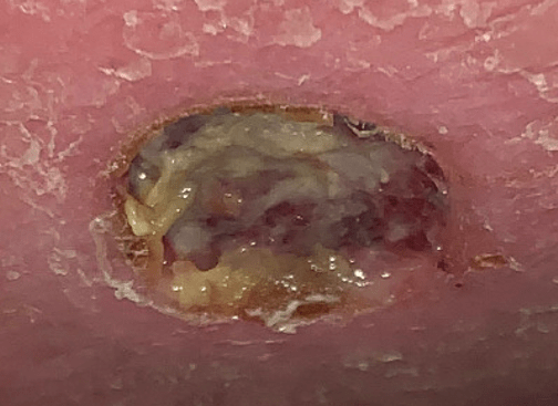 A middle-aged man with osteogenesis imperfecta, poorly controlled HIV, and hepatitis C presented for outpatient management of an infected non-pressure ulcer on his ankle. The patient had no history of recent travel and was current on vaccinations. He was afebrile but reported increasing difficulty with ambulation due to pain from the lesion. Per the patient, the wound began as an itchy “bug bite” two weeks prior, which he had scratched, causing skin breakage. The ulcer became progressively larger with corresponding increases in pain, warmth and swelling. Specimens from the ulcer were collected for culture, and the patient started empiric doxycycline in addition to prophylactic amoxicillin/clavulanate he was already taking for management of a pre-existing ulcer on the opposite foot. The non-healing wound progressed to the size of a nickel with worsening pain. Due to these symptoms and the associated microbiological data, the patient was instructed to present to the emergency department where he was admitted for additional evaluation. Upon admission, the ulcer exhibited no surrounding erythema, but a slight exudate and pitting edema was noted (Image 1). An X-ray of the ankle was obtained which revealed soft tissue swelling, but no fracture or crepitus.