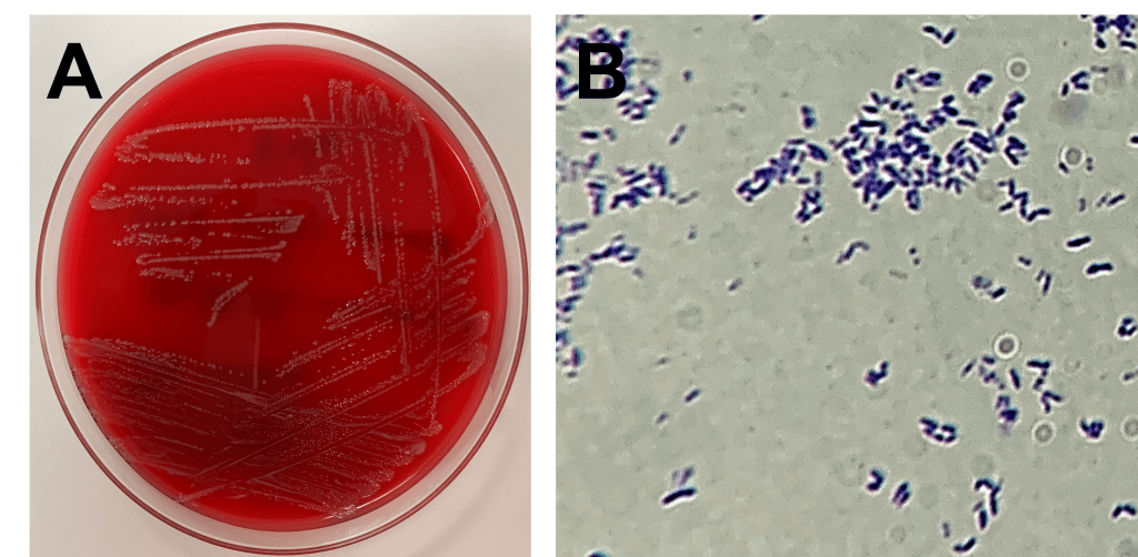 Specimens of the ulcerated lesion were submitted to the microbiology laboratory for routine bacterial culture. No growth was observed on MacConkey agar plates, while two beta-hemolytic morphotypes and one non-hemolytic morphotype were observed on blood agar. The two beta-hemolytic species were identified as Streptococcus dysgalactiae and Arcanobacterium haemolyticum by MALDI-TOF MS. The third, non-hemolytic organism was a catalase-positive, gram positive coryneform rod (Image 2A and B), and was identified by MALDI-TOF MS as Corynebacterium diphtheriae. This identification was subsequently confirmed by both a commercial reference laboratory and the US Centers for Disease Control and Prevention.