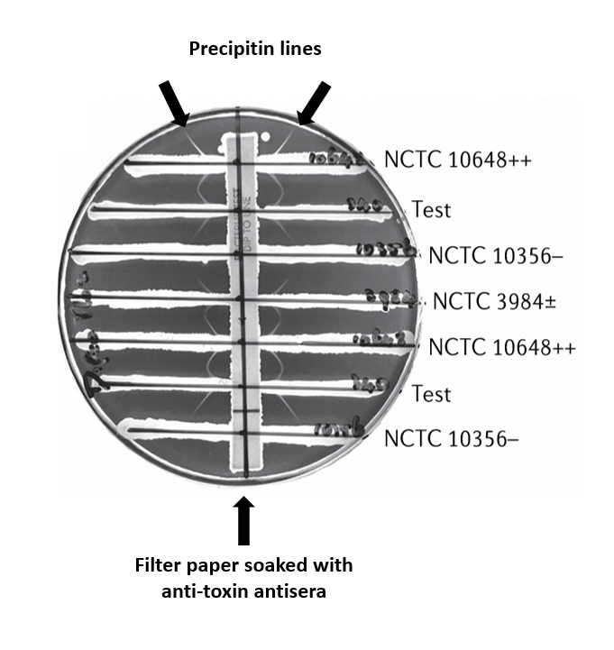 Recovery of C. diphtheriae in the routine setting is challenging as the organism morphologically resembles other coryneform rods usually representative of flora in cutaneous and respiratory specimens. While selective and differential medias are available (i.e. Cystine Tellurite Blood Agar or Tinsdale medium), they are not used routinely due to low incidence. As both toxigenic and non-toxigenic strains of C. diphtheriae circulate, this isolate was referred to the CDC’s Pertussis and Diphtheria laboratory for additional typing and toxin analysis. The organism was determined to belong to the mitis biotype and was positive for the tox gene by PCR. Toxin gene expression was then evaluated by the Elek Immunodiffusion test (Image 3). In this classical method, a filter paper strip saturated with anti-toxin is placed perpendicular to control and test strains of the organism on non-selective media. If the organism expresses diphtheria toxin, the toxin and the antisera form a complex and precipitate from solution. This phenomenon is visualized as precipitin lines in the agar after 24 hours of incubation at 37°C.4 Despite tox gene PCR-positivity, the Elek Immunodiffusion test revealed that this patient’s isolate did not express diphtheria toxin. Thus, this C. diphtheriae isolate was a representative example of a NTTB strain.