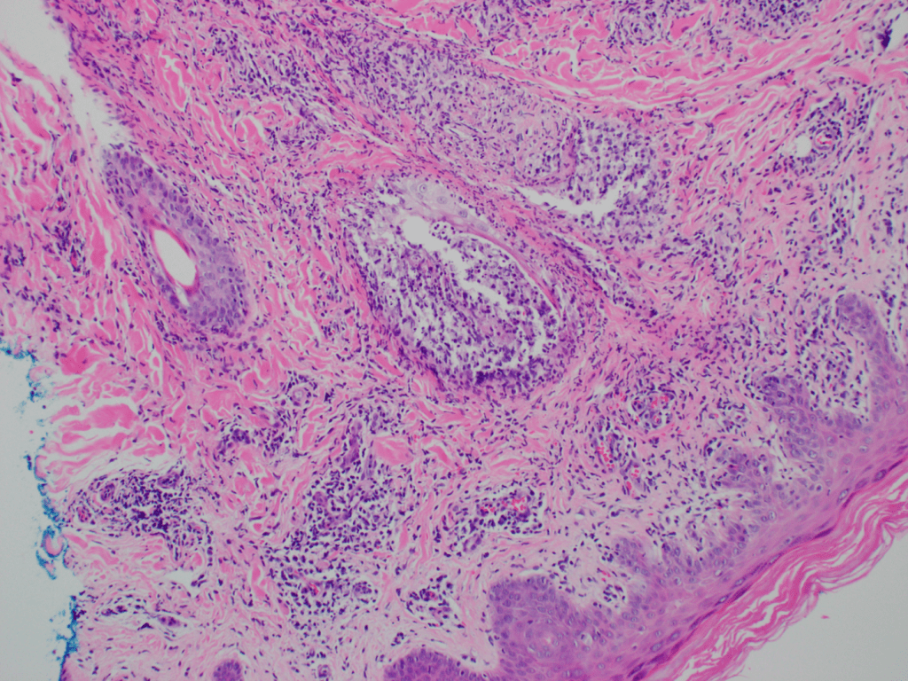 An adult patient with no significant past medical history presents with a tender right inguinal mass and rash over the right buttock measuring 5×7 cm. A skin punch biopsy was performed on the gluteal rash and sent to histopathology for analysis. Histology (Image 1) revealed an intradermal acantholytic vesicular dermatitis and associated folliculitis. Chronic inflammatory infiltrates surrounded neurovascular bundles as well as adnexal structures. Multinucleated Tzank cells were identified with the characteristic multinucleation, margination, and molding. Scattered eosinophilic Cowdry A inclusions were seen. Stains for bacteria and acid-fast bacilli (AFB) were not performed. A periodic acid-Schiff (PAS) stain (Image 2) demonstrated the absence of fungal elements.