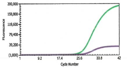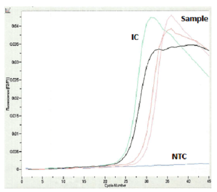 While molecular methodologies are now the gold standard for diagnosis, a number of modalities including immunohistochemistry, immunofluorescence, in-situ hybridization, and serology can be used to aid in diagnosis.3 In the aforementioned case, diagnosis was made using a real time polymerase chain reaction (RT-PCR) assay (Simplexa VZV Direct Assay, Image 3) using previously extracted DNA. Forward and reverse primers target a well conserved portion of the VZV DNA polymerase. In between synthesis cycles, fluorescent probes anneal to the target sequence, separating the fluorophore from the quencher, thus generating a fluorescent signal. Amplification is measure by the cycle threshold (Ct), the number of PCR cycles needed for the fluorescent signal to exceed the background. An internal positive control (IC) is spiked in to assure negative results are not the result the presence of PCR inhibitors. To assess the quality of DNA present, a separate PCR was also performed on TP53, which amplifies if sufficiently high quality DNA is present, irrespective of the presence of VZV DNA (Image 4). A negative control (no template control, NTC) should be run to interrogate the presence of nucleic acid contamination.4