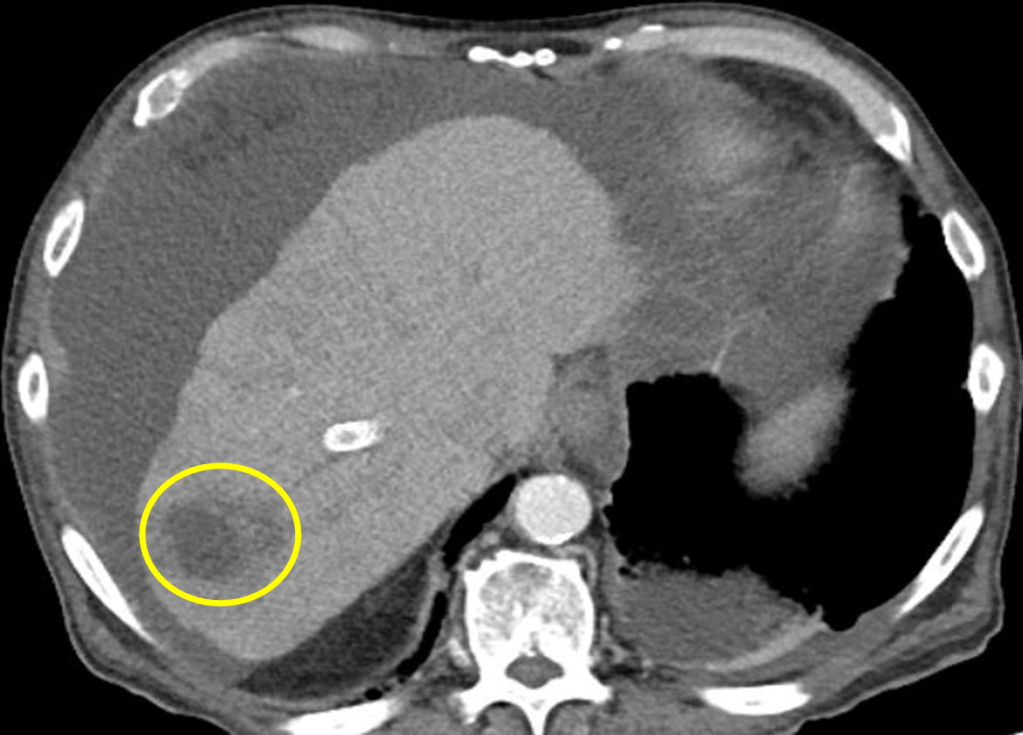 Image 1. CT scan of abdomen showing irregularly shaped hypodense lesion (yellow circle).