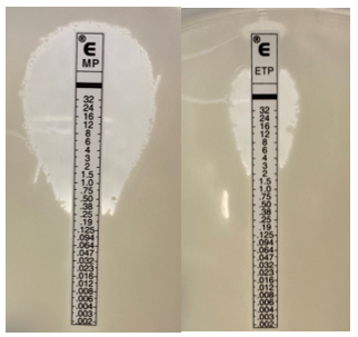 Scenario 2: An 80 year old female underwent a Whipple procedure for a pancreatic mass. A wound culture was submitted from the operating room which grew both Streptococcus anginosus and Enterobacter cloacae complex. Phenotypic AST for the E. cloacae revealed susceptibility to ertapenem (≤0.5 mg/ml) but resistance to meropenem (4 mg/ml). The isolate was pan-susceptible to other drug classes (aside from intrinsic resistance). Similar to Case 1 above, identification was confirmed by the MALDI-TOF MS and the isolate was subcultured with selective pressure. A Cepheid Carba-R test did not detect any carbapenemases. However, upon repeating a phenotypic test, both ertapenem and meropenem were susceptible. Our investigation here led to the avoidance of reporting an incorrect phenotypic AST result.