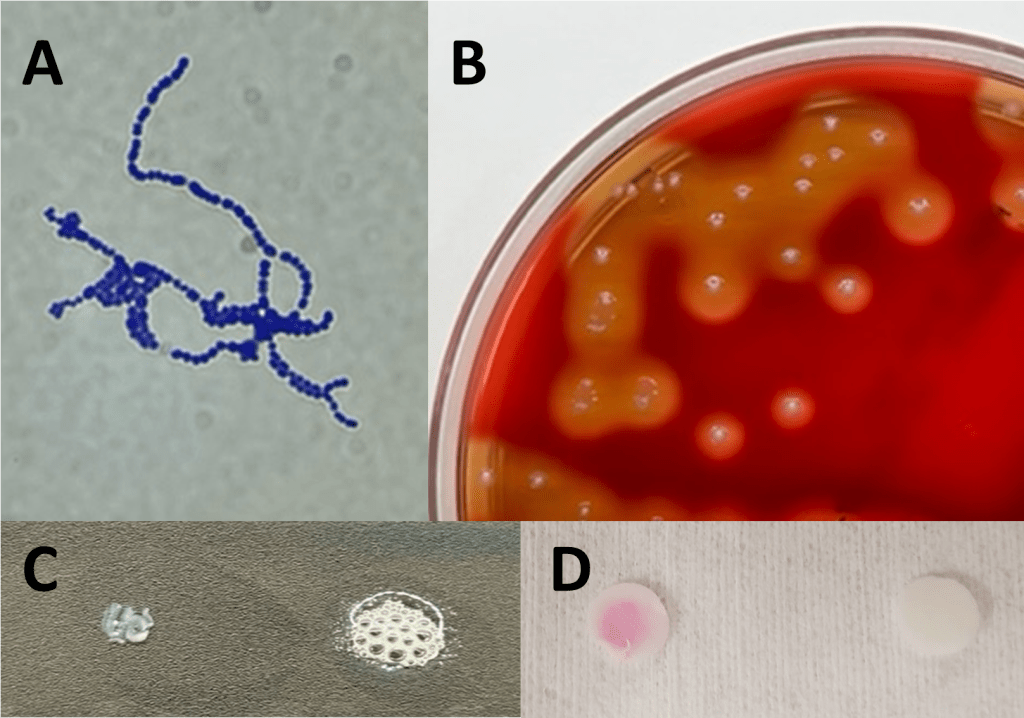Image 1. Colony appearance and biochemical testing of S. pyogenes. A) Typical gram positive cocci in chains characteristic of streptococci. B) Growth on Sheep’s Blood Agar of small, translucent colonies with a wide zone of beta-hemolysis indicative of S. pyogenes. C) Catalase-negative S. pyogenes (left) compared to catalase-positive S. aureus (right). D) PYR-positive S. pyogenes (left) compared to PYR-negative S. aureus (right).