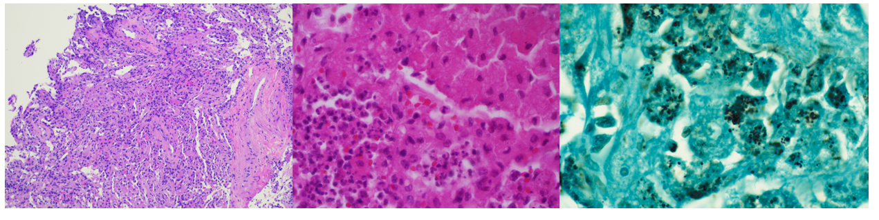 R. equi is a member of the aerobic actinomycetes. Like Nocardia sp., the cell wall of R. equi contains mycolic acids which lead to positivity when stained with a modified acid-fast stain. The organism is a facultative, intracellular pathogen surviving within macrophages and histiocytes, leading to granulomatous inflammation, eventually leading to necrosis.2 Immunosuppression (including HIV infection or immunosuppressive therapy) is a major risk factor for R. equi infection, as most clinical cases are reported in this setting. In immunocompromised hosts, the spectrum of disease manifestations of R. equi are diverse, but most commonly (approx. 80%) include pulmonary involvement3 with upper lobe cavitary pneumonia.4 Characteristic malakoplakia (an infiltration of foamy histocytes with intracellular bacteria and basophilic inclusions name Michaelis-Gutmann bodies)1 can be associated with R. equi infection. These structures were noticeably absent in this patient’s case despite the observed histocyte aggregation and mononuclear infiltrate (Image 2, center, left).
