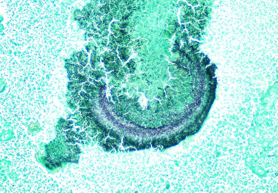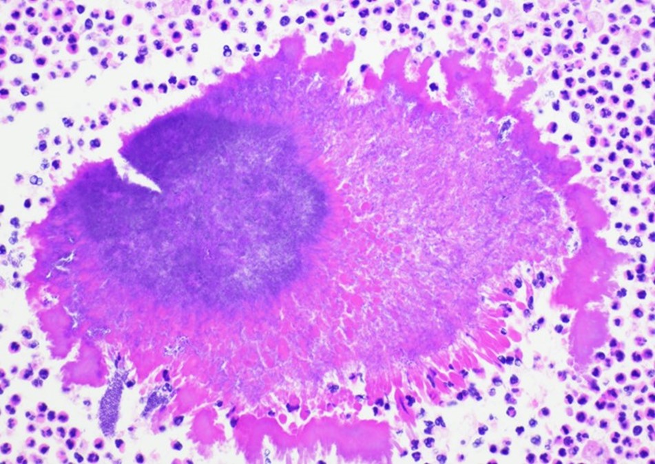 Figure 1. Granule with surrounding Splendore-Hoeppli material (H&E 400x magnification).