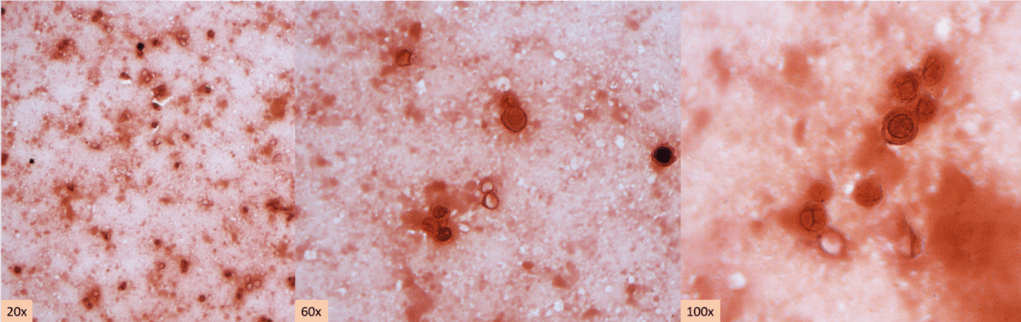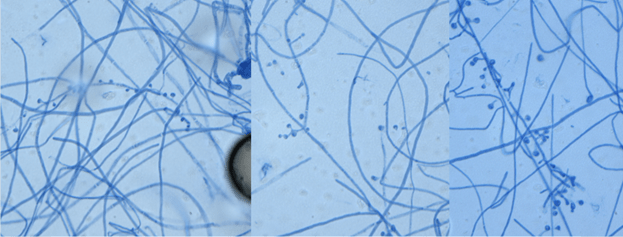 Although growth of fungi took 2 days in our case, Blastomyces is a slow growing fungi in that mycelial forms mature in 14-21 days. In suspicious cases, cultures should be hold up to 8 weeks. Furthermore, Blastomyces should be cultured as soon as possible since it does not survive well in samples. Morphologically, Blastomyces colony appears as a mold, which is white, prickly, and cottony at 25-30 °C However, at 35-37 °C, the colony appears as a yeast, which is tan, wrinkled, and waxy. Microscopically, at 37 °C, Blastomyces appear as round to oval cells with refractile and thick cell walls and measure 8 – 15 uM in diameter. Each yeast cell produces only one, broad-based (4-5 uM), bud. At 25-30 °C, septate hyphae form with short or long conidiophores. Round to pear-shaped conidia attach to the apex, resembling lollipops (Image 5).4
