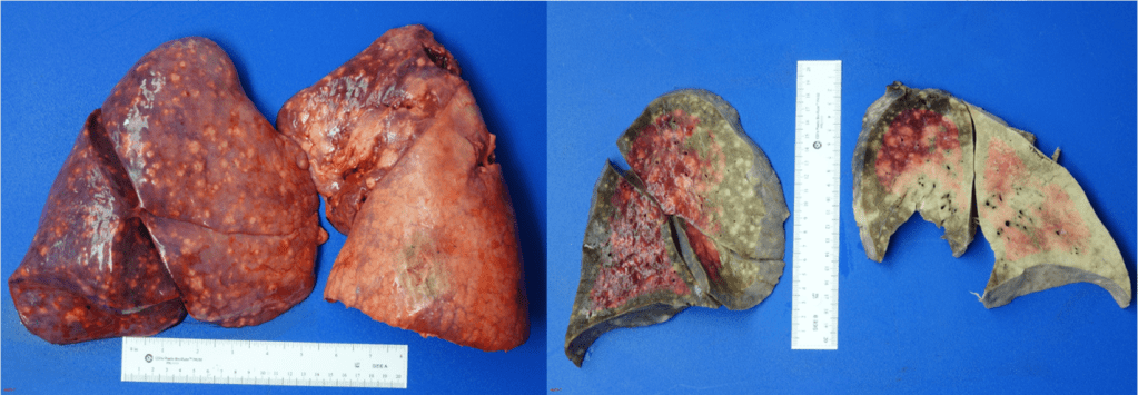 A middle-aged patient with a complex past medical history presented to the Emergency Department with the primary complaints of shortness of breath and cough. The patient had recently been admitted for community-acquired pneumonia and discharged with antibiotics 10 days ago. However, the patient continued to have a dry cough, a fever of 102 degrees F, and shortness of breath. On the new admission, they were noted to be hypotensive and labs showed elevated WBC (14.7), lactate of 7.3, proBNP of 852, and procalcitonin of 4.62. Bacterial blood cultures showed no growth. A chest x-ray showed worsening left lower lobe consolidation with extension to the left upper lobe, compared to the x-ray at the previous admission. A bronchoscopy was done and bronchoalveolar lavage (BAL) was submitted for Gram stain, aerobic bacterial culture, and fungal culture. The Gram stain and bacterial culture were negative. However, the fluorochrome stain showed many large budding yeast forms, most suggestive of Blastomyces dermatitidis. Lung tissue sample culture (Image 1), Gram stain (Image 2) and histopathology (Image 3) confirmed the identification as Blastomyces dermatitidis. The patient was expired before the results were released. Gross images of lungs are shown in image 4.