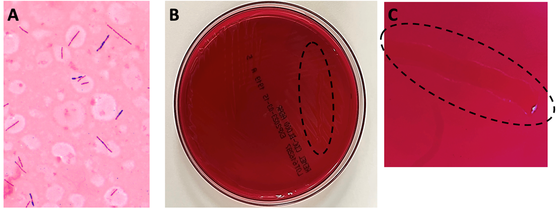 Anaerobic bottles from blood cultures collected at the time of hospital admission flagged positive in under 24 hours. Gram staining from the positive bottle broth revealed large, gram variable bacilli (Image 1A). Multiplex PCR performed on the positive blood culture broth failed to reveal the identity of the organism. After 24 hours, close observation was required to visualize bacterial growth on anaerobic blood culture media, which appeared as a thin, translucent film (Image 1B). To provide better visualization for this case, a loop was utilized to scrape the growth so a path could be observed within the biomass (Images 1B and 1C, dotted lines). The bacterium recovered was definitively identified as Clostridium septicum by MALDI-TOF MS, prompting continued coverage with piperacillin/tazobactam until discharge.