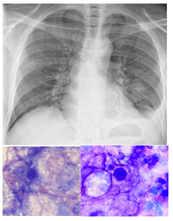 Previously classified as a protozoa, Pneumocystis jirovecii (formerly known as Pneumocystis carinii) is currently considered a fungus based on nucleic acid and biochemical analysis. Stringer et al. proposed the change in nomenclature in early 2002, in honor of the Otto Jirovec, who was credited by some, as the original descriptor of the organism in human hosts.1 A few Pneumocystis species have been described in a wide variety of mammalian hosts but P. jirovecii is only capable of infecting humans and is not capable of infecting other animals.4 P. jirovecii infection mostly affects the immunocompromised patients and can lead to severe, life-threatening disease. HIV is one of the most commonly encountered underlying diseases, but individuals with cancer, transplant recipients and hosts receiving immunosuppressive medication can be at risk. The route of transmission is thought to be person to person through air transmission. Immunocompetent hosts can act as reservoirs of the organisms and spread it to the immunocompromised. The use of antiretroviral therapy and prophylactic medication on HIV patients has substantially decreased the incidence of PJ infection in this population.2, 3 Defects in cellular immunity, specifically CD4+ T-cell-mediated immunity is a predisposing factor for the development of severe Pneumocystis infection. The disease is usually a pneumonia that can have a slow progression or progress rapidly. Fever, nonproductive cough, tachypnea, and severe dyspnea with hypoxia are the most common symptoms.