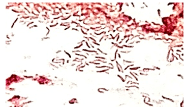 A stool sample was sent to the Microbiology Lab for PCR testing, and both Vibrio and Vibrio cholera targets were detected. The stool was then plated for culture confirmation. Hemolytic colonies grew on the blood agar plate (Figure 1), and yellow (original medium color green) colonies grew on thiosulfate citrate bile sucrose selective agar due to sucrose fermentation (Figure 2). Gram stain from these colonies showed gram negative, curved, comma-shaped rods (Figure 3) and MALDI-ToF identification revealed Vibrio albensis. The specimen was sent to the Department of Public Health for confirmation, which reported Vibrio cholerae O1 serovar Ogawa with O1 antigen typing.