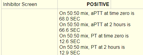 An inhibitor screen/mixing study was performed and was positive. An inhibitor screen is performed by mixing the patient’s plasma with pooled normal plasma and running a PT or PTT.  If the PT/PTT corrects than the screen is negative. This means that a factor or factors were deficient in the patient’s plasma and were replaced with the pooled normal plasma resulting in a correction of the PT/PTT. In this case, a PTT at time 0 of 68 seconds and a PTT at 2 hours of 66 seconds was a failure to correct and indicated that an inhibitor was present, thus a positive result was entered.