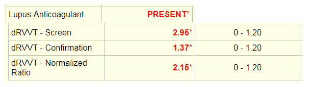 The dilute Russell’s viper venom time (dRVVT) was used to test for a lupus anticoagulant. The screening test is performed by adding Russell viper venom, which directly activates coagulation factor X in the presence of calcium and a phospholipid poor reagent to the patient’s plasma and calculating time to clot. The confirmation test is the same assay with added excess phospholipid. In the presence of phospholipid dependent antibodies, the time to clot will be shorter for the confirmation test. The screen and confirmation ratios are normalized ratios (NR) of the patient sample result in seconds divided by the mean of the normal range in seconds. If the screen is <1.20, the confirmation test will not be run. If the screen is greater than 1.20 as seen here, the confirmation test will be run. The end result is reported as a normalized ratio of the screening test over the confirmation test. If the NR is greater than 1.20, than a lupus anticoagulant is reported as present.