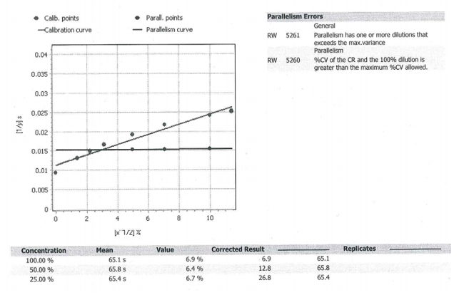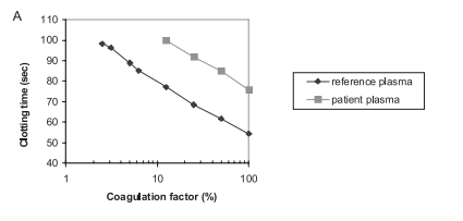 This is an example of a factor assay that shows parallelism. The reference plasma calibration curve and the patient plasma are parallel lines. 1