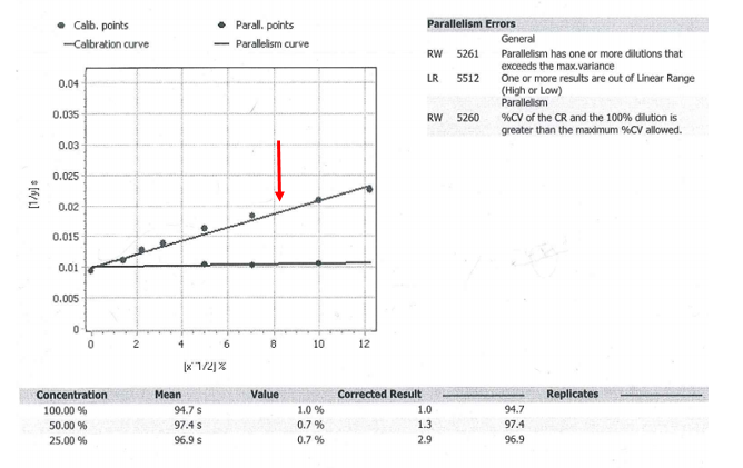 Upon review, the factor XI assay did show parallelism errors. Parallelism is tested by performing serial dilutions of a standard with known normal concentrations of factor and recording the time to clot. This line is shown with the red arrow. In contrast, the patient sample appears to be a flat line that is not parallel to the calibration curve. Parallelism errors were flagged because from the 50% to 25% dilution, the corrected results more than doubled. If there is a >20% change between dilutions, this indicates possible interference and additional dilutions should be run to dilute out the inhibitor. The 25% dilution had a corrected result of 2.9, which was greater than a 20% increase from the 50% dilution result of 1.3. Once more dilutions were performed; the Factor XI level was ultimately close to 100%.