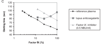 This curve shows that the factor IX inhibitor line is parallel to the reference plasma, while the lupus anticoagulant line is not. 1