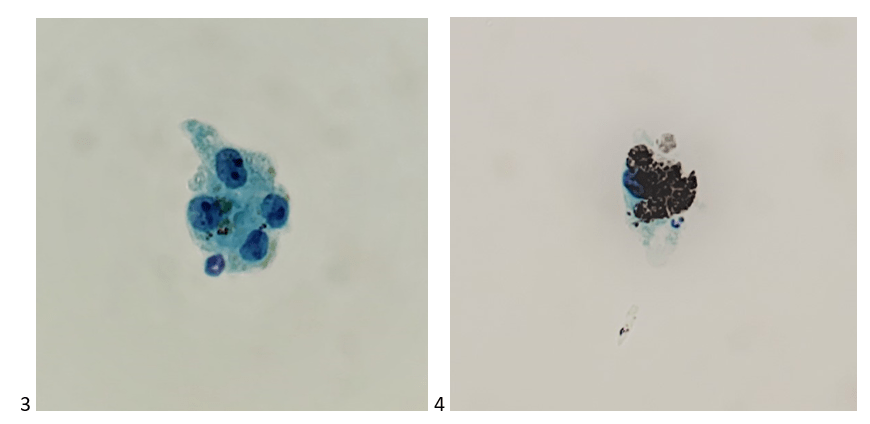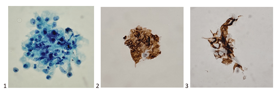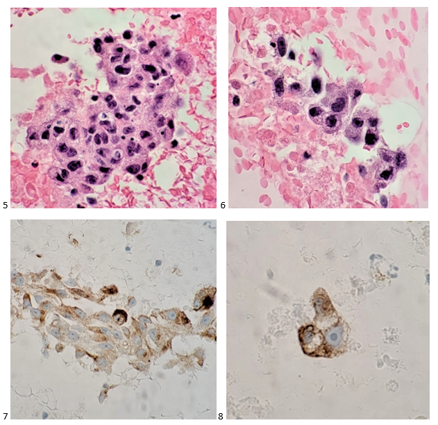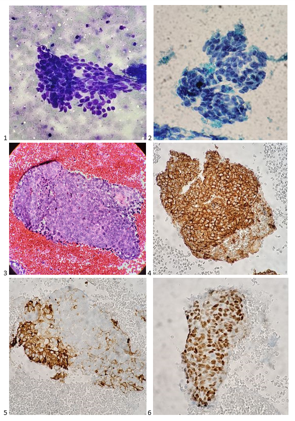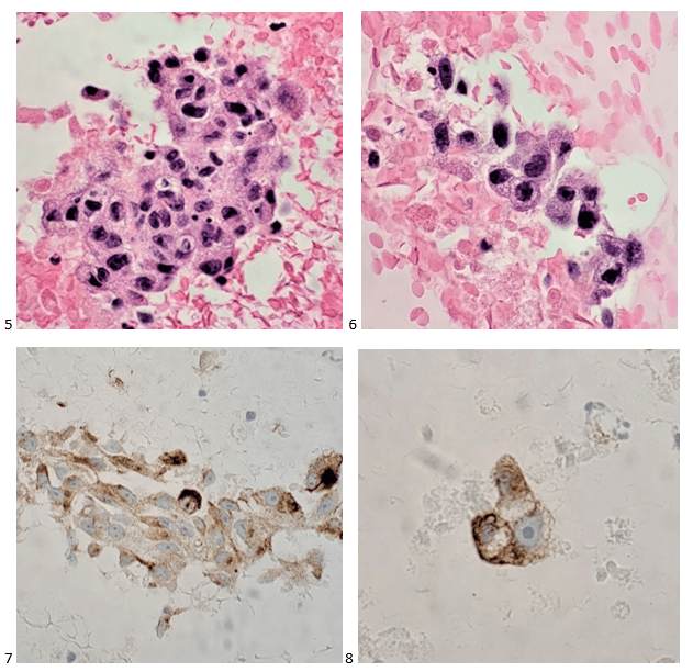 The cell block confirmed my non-heme diagnosis and kept my differentials at bay. The attending pathologist ordered an immunohistochemistry profile of S100, HMB-45, and Melan A, as well as AE1/AE3. The first three immunostains (prior to our adoption of SOX-10) confirmed a diagnosis of metastatic malignant melanoma. Soon thereafter, the patient’s primary lesion was identified on his back, and he was treated with radiation and immunotherapy. Unfortunately, the metastases were not responding to the immunotherapy, and a few days after a clinical trial was offered, the patient passed away.