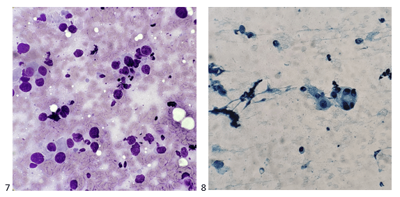 Image 7,8: US-guided FNA of right cervical lymph node, Diff-Quik and Papanicolau stains. Metastatic PD Breast Carcinoma.