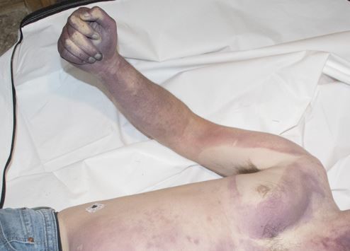 Image 2. This decedent’s right arm is defying gravity due to rigor – he was initially face down, and his arm musculature became temporarily fixed in this position. Rigor can be forcibly broken if needed, but will also break down as decomposition proceeds.