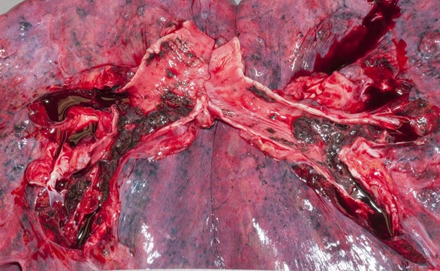 This image shows dark black soot lining the main and lobar bronchi; this indicates the victim was breathing during the fire.