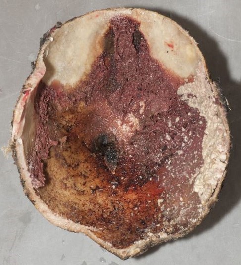 The scalp has been consumed by fire, and the exposed bone is calcined and brittle with fractures of the outer table.