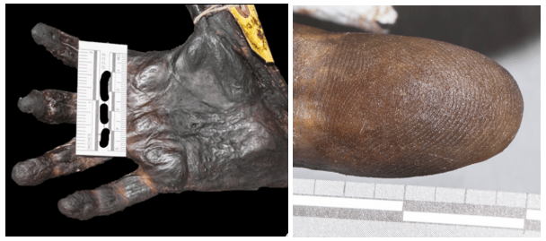 The mummified remains of a young adult were found in an abandoned house; while the fingertips were initially too dessicated to yield fingerprints, rehydration revealed excellent ridge details. Fingerprints were then uploaded to AFIS, and the decedent was identified within an hour.