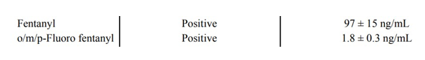 Looking at this in isolation, it would be easy to assume this person died from an overdose. Even low levels of fentanyl can be dangerous to an opioid-naive individual – a level this high is rare. Then there’s the added presence of fluoro fentanyl, a fentanyl analog, which would seem to support the notion of an overdose. The problem with this assumption? This person died from blunt force trauma as a pedestrian struck by a car. He was, according to witness accounts, walking and talking right until the moment of impact. Autopsy had shown multiple blunt force injuries incompatible with life.