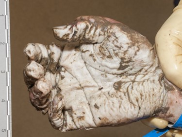 Figure3. Wrinkling and paleness of the hands and feet is often seen in bodies recovered from water, whether or not the cause of death was actually drowning.