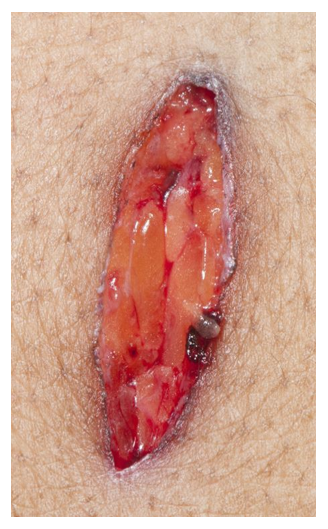 In contrast, this exit wound is slit shaped, and the wound edges can be neatly reapproximated.