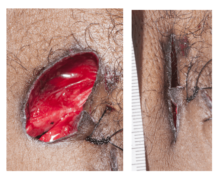 This stab wound initially has very unclear morphology (on the left) due to tension placed on the wound by skin elasticity and nearby sutures. Once the wound is reapproximated (on the right), there are clearly two tapered edges which may be consistent with a double-edged blade.