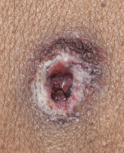 This entrance wound has stippling on the surrounding skin; occasionally gunpowder particles are still visible embedded in the abrasions.